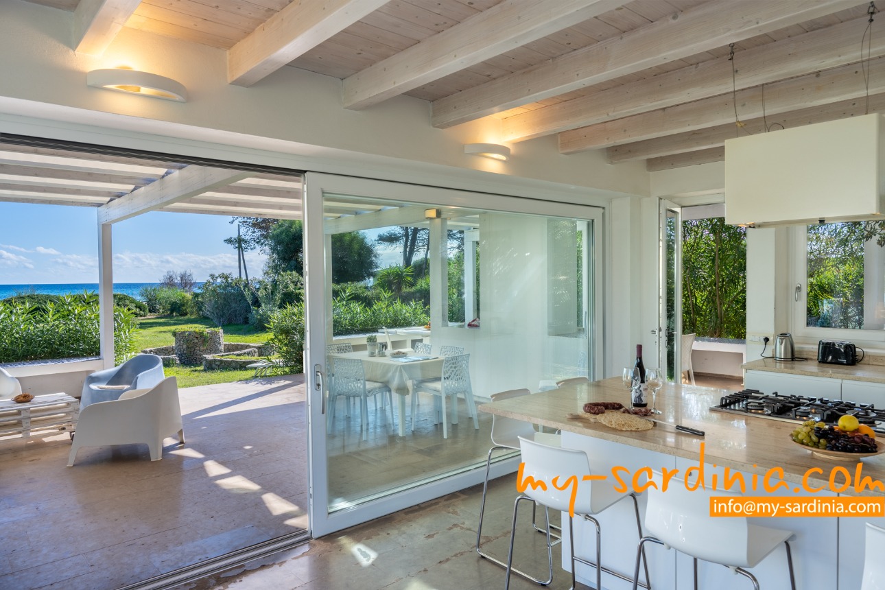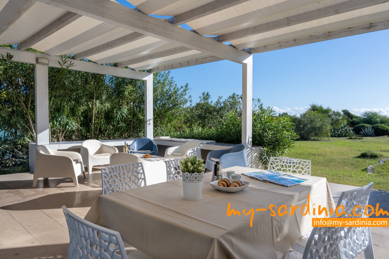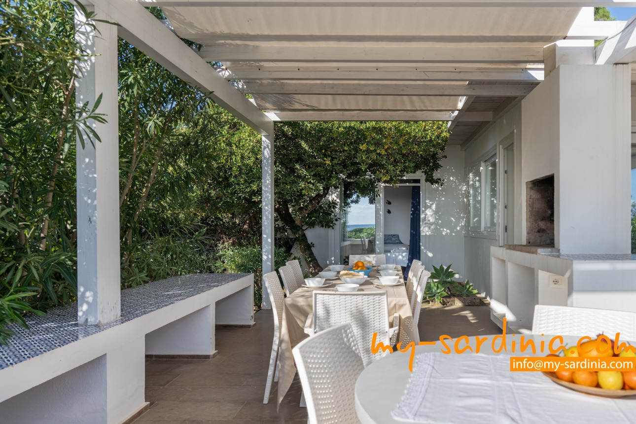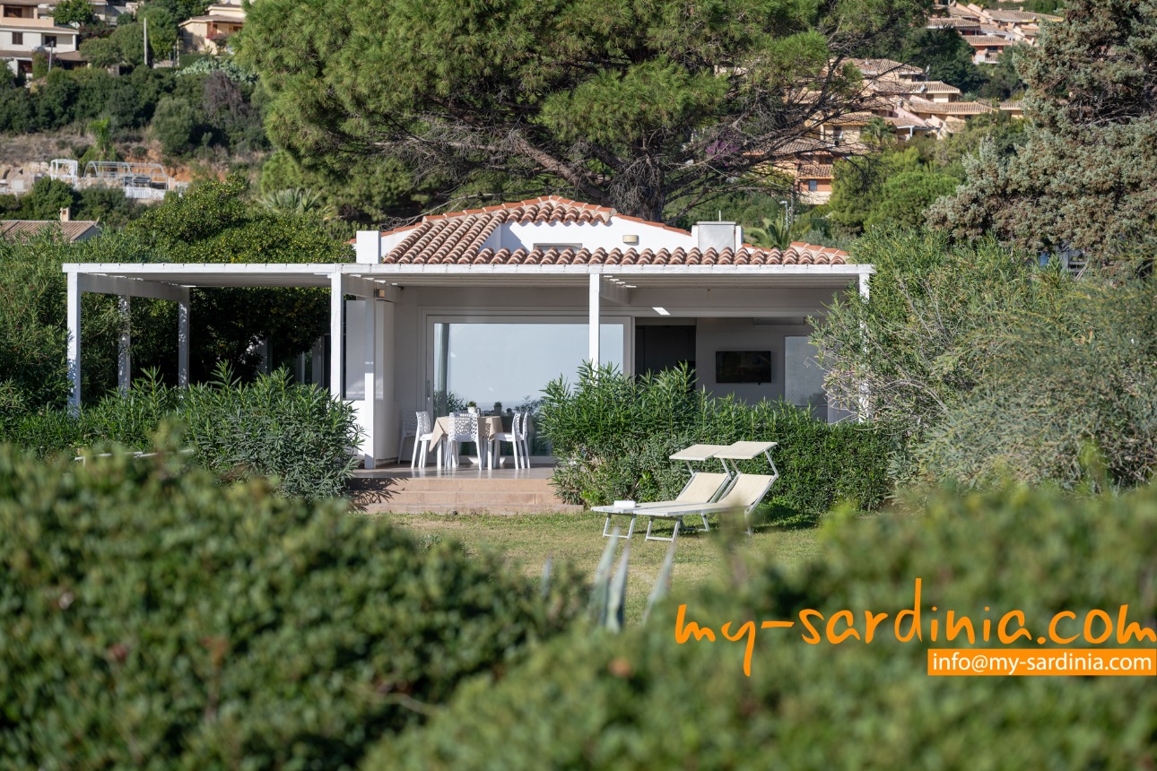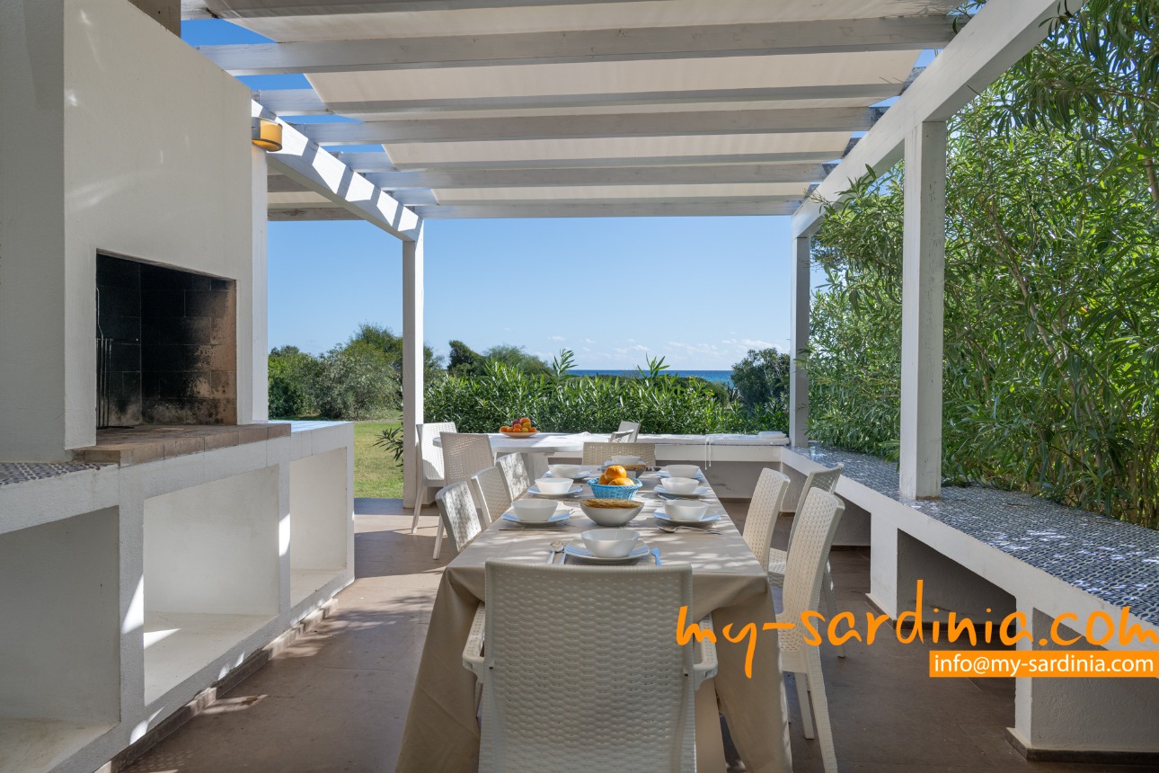 Ganz besonders gelungen ist die Terrasse, deren gemauerten Sitzbänke rund um den Barbecue gruppiert sind und viel Platz bieten. Sie sehen von der Terrasse in den Garten und auf das Meer, denn das Grundstück grenzt direkt an den Strand.