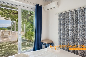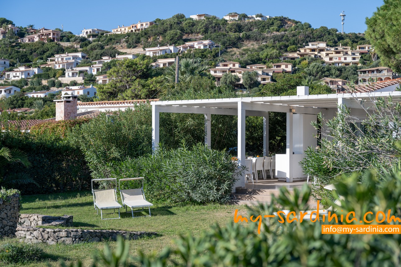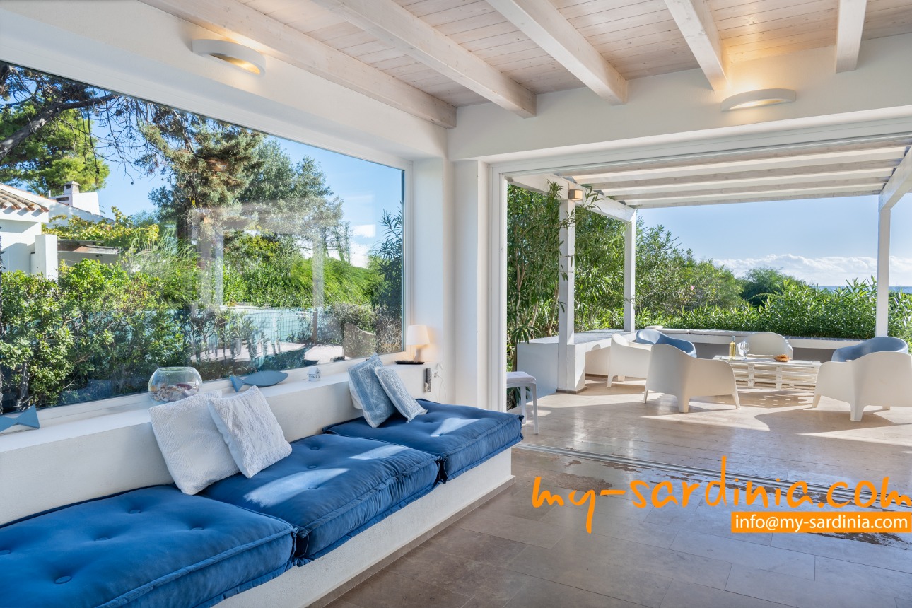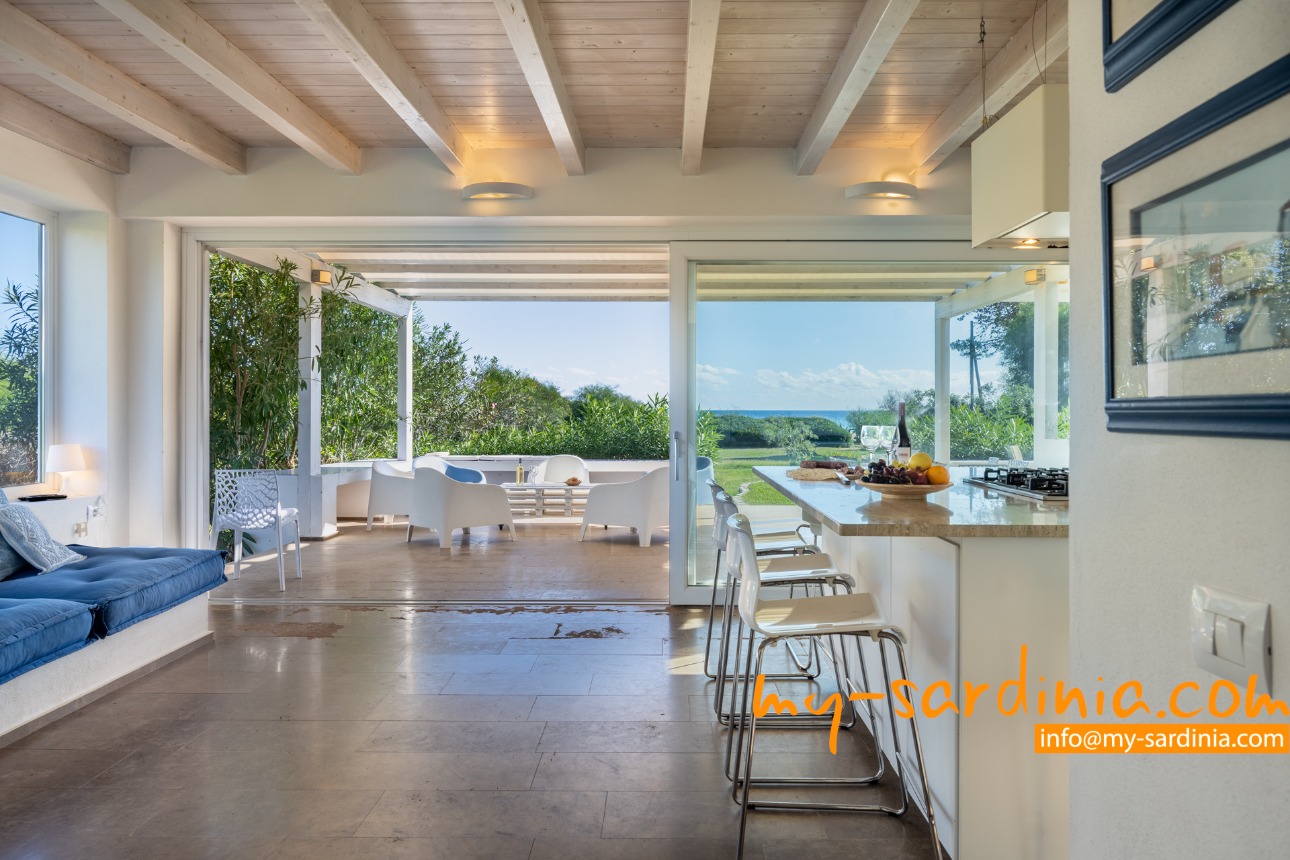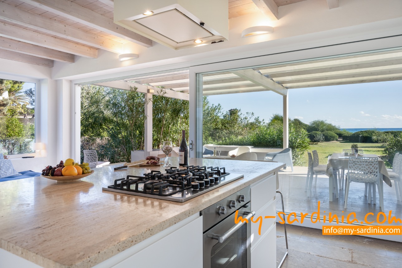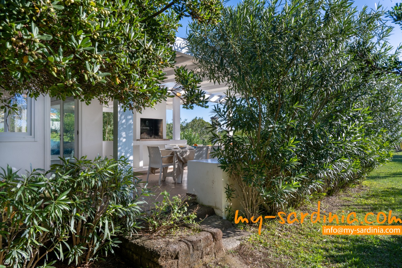 Ganz besonders gelungen ist die Terrasse, deren gemauerten Sitzbänke rund um den Barbecue gruppiert sind und viel Platz bieten. Sie sehen von der Terrasse in den Garten und auf das Meer, denn das Grundstück grenzt direkt an den Strand.