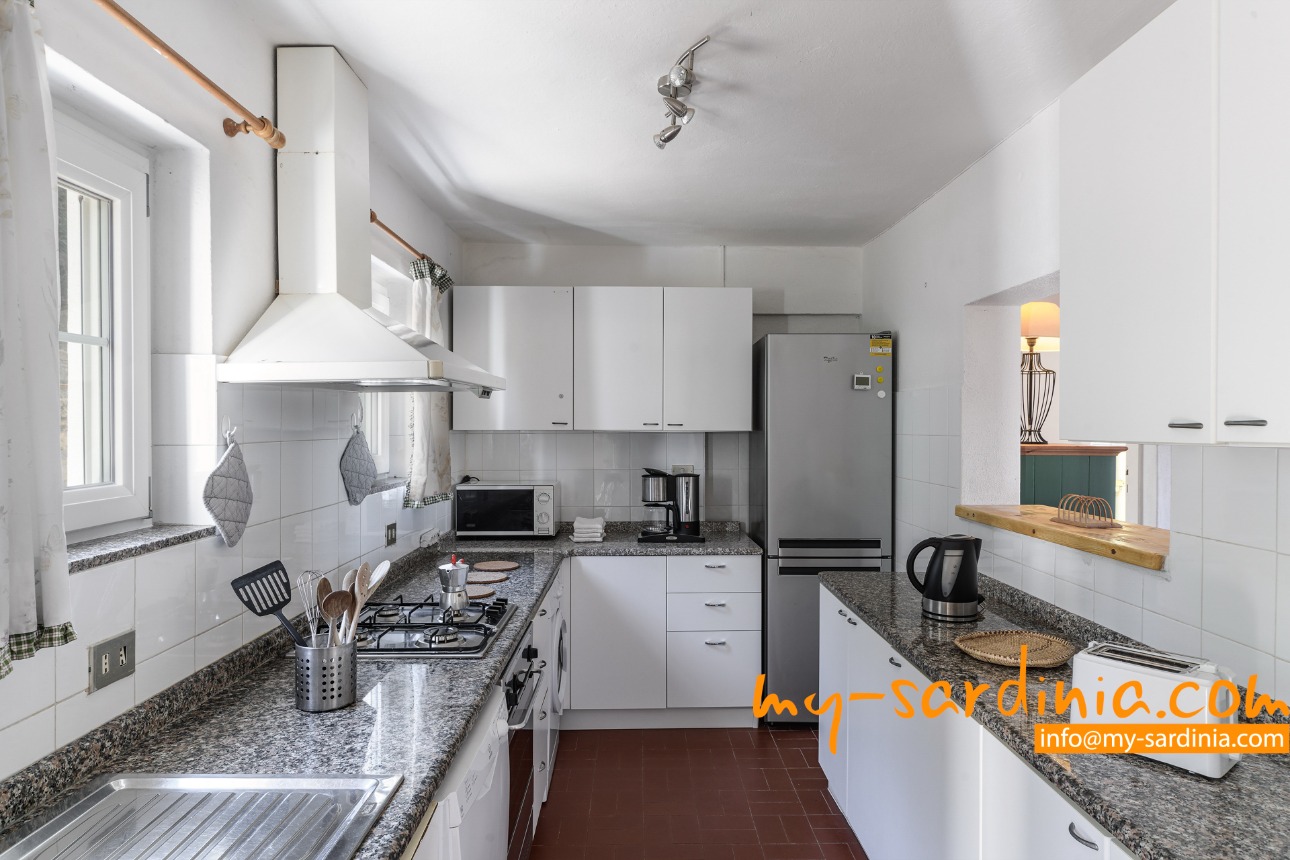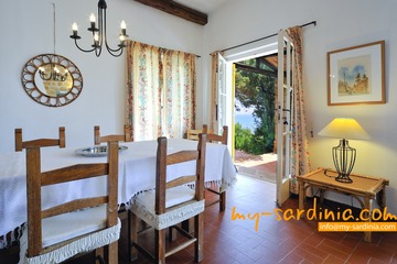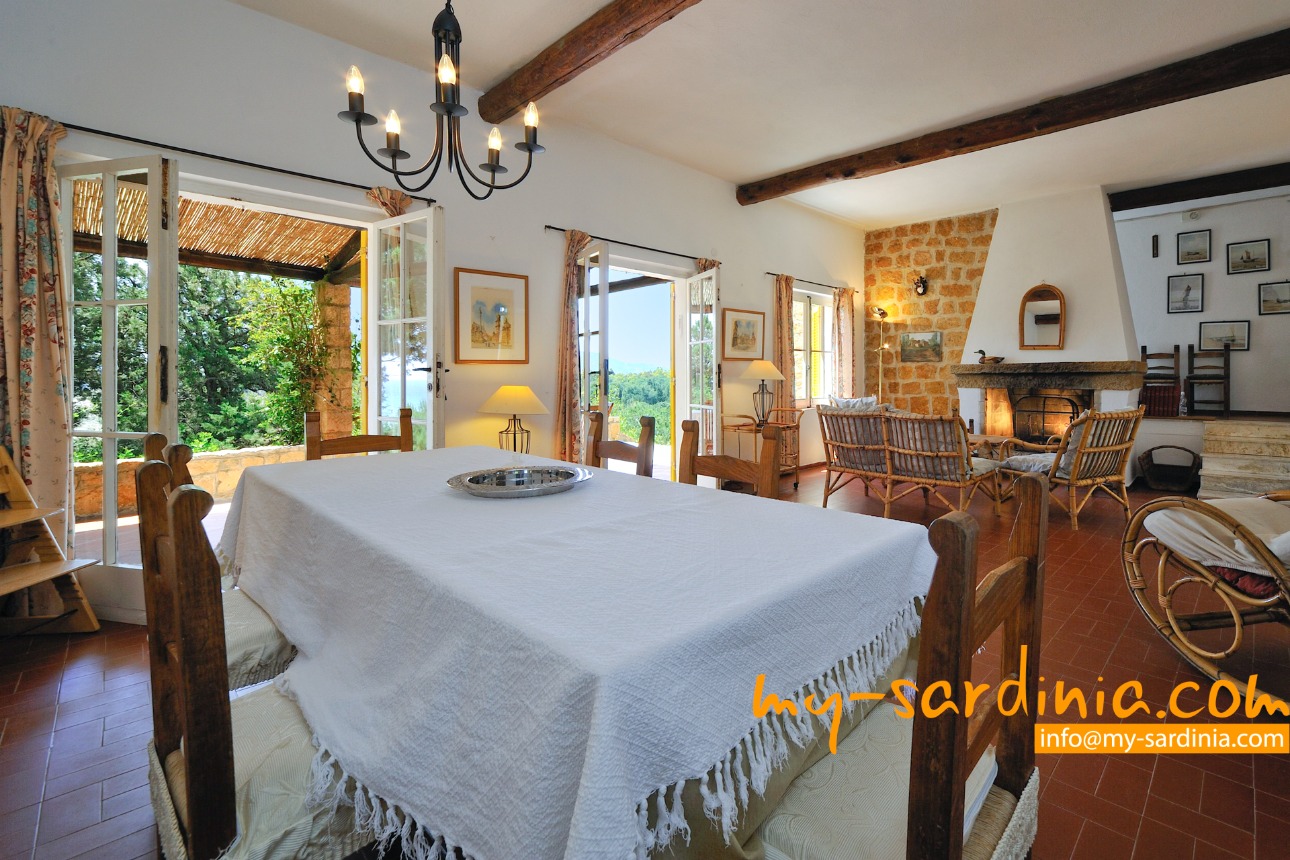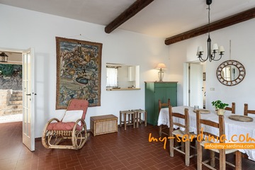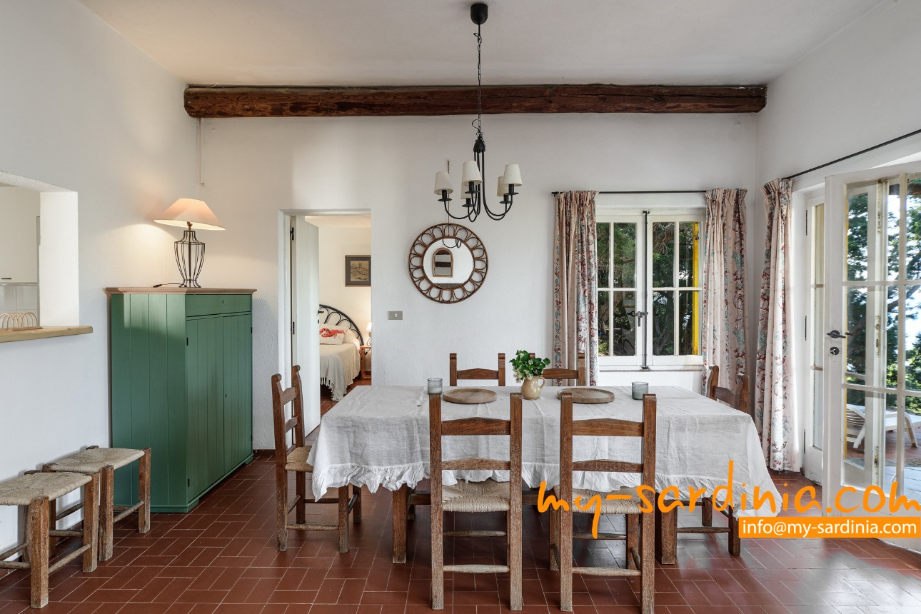 Villa Bau Cannas bietet Platz für bis zu 6 Personen in drei Schlafzimmern, die sich auf zwei Ebenen verteilen. Das Herzstück des Hauses ist der geräumige Wohnraum mit freiliegenden Holzbalken, warmen Terrakotta-Böden und einem offenen Kamin – in der Vor- und Nachsaison lädt er zu langen Abenden im Schein des Kaminfeuers ein. Große Terrassentüren öffnen den Wohnraum zur überdachten, schilfgedeckten Terrasse, auf der ein großer Esstisch steht und der Blick weit über die Küstenlandschaft und das Meer schweift. Die vollständig ausgestattete Küche verfügt über Geschirrspülmaschine, Backofen und Kühlschrank; eine Durchreiche verbindet sie mit dem Wohnzimmer.