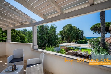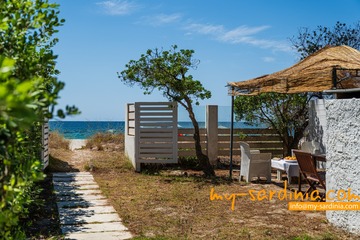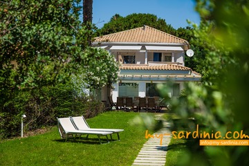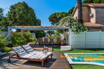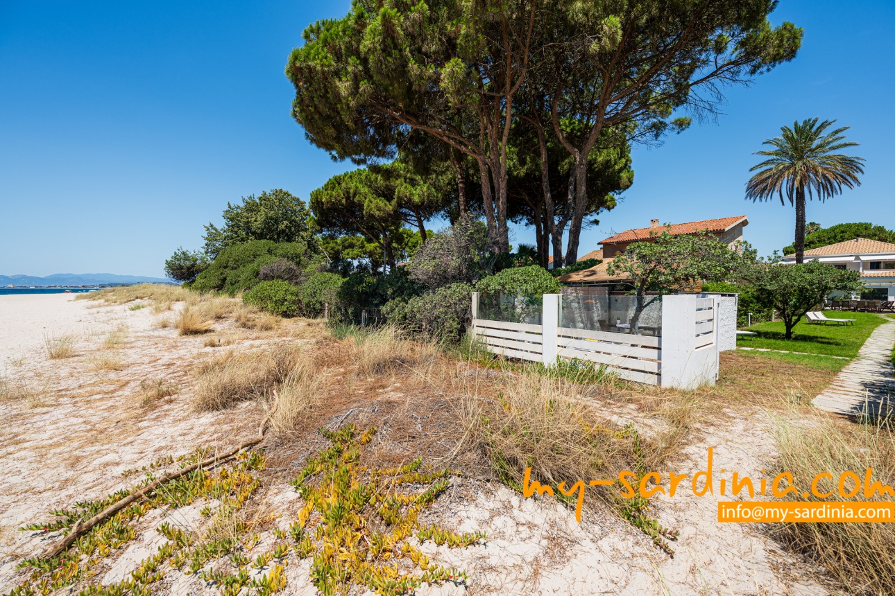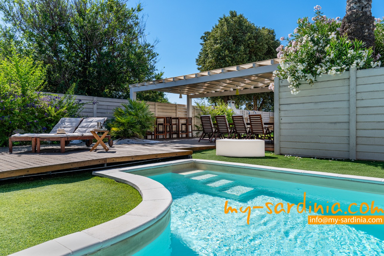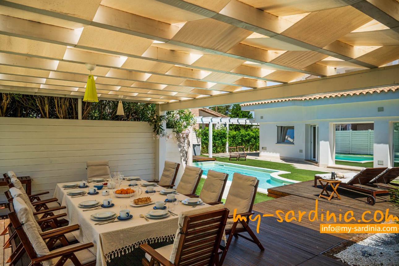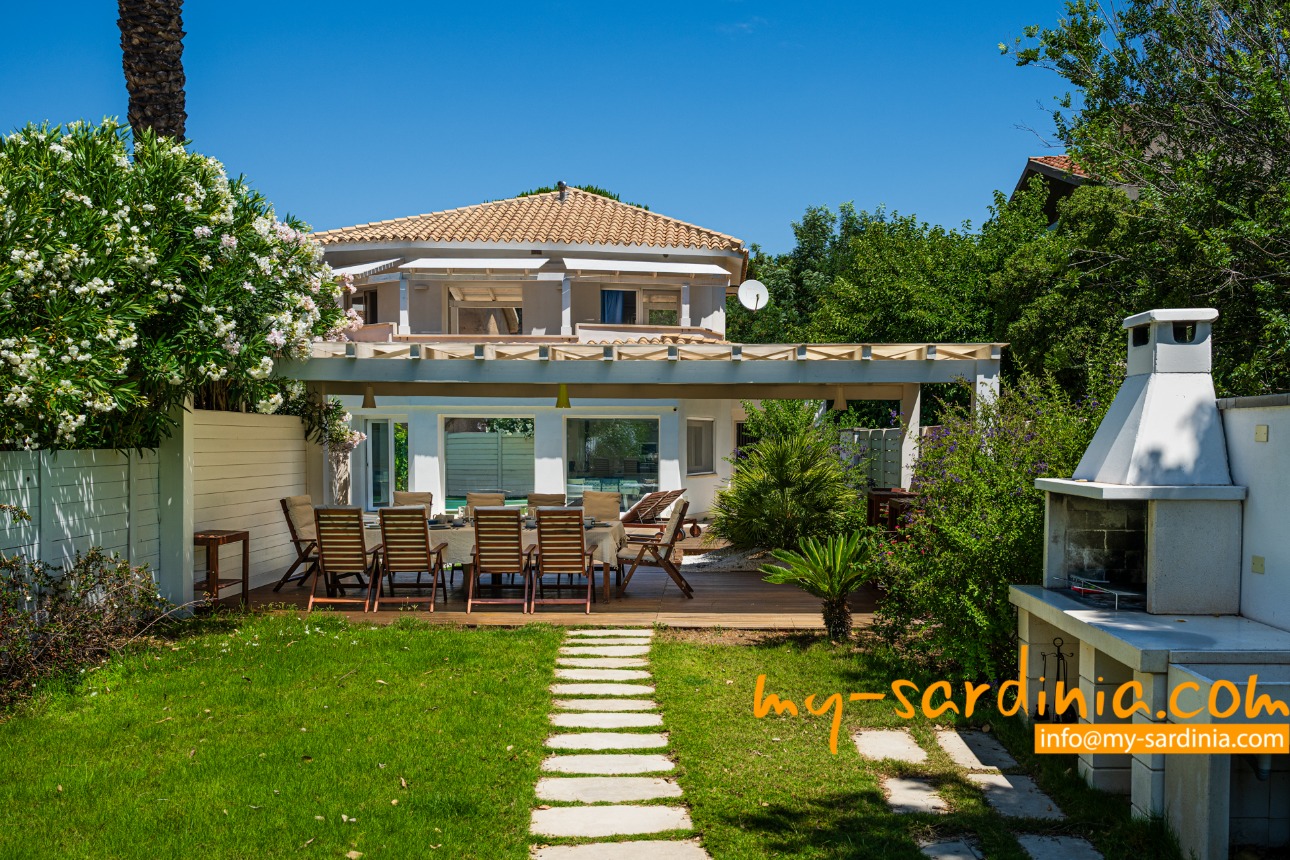 Das Highlight des Außenbereiches der Villa ist der private Pool, um den verschiedene Sitz- und Liegemöglichkeiten zum Sonnenbaden und zur Entspannung bereit stehen. Ein überdachter Bereich bietet nicht nur angenehmen Schatten an heißen Tagen sondern wird mit dem großem Esstisch und den Sitzgelegenheiten zum Zentrum des abendlichen Beisammen-Seins in der lauen Nachtluft – ein großer, gemauerter Grill steht bereit. Wenige Schritte über eine Rasenfläche führen zum Gartentor mit direktem Strandzugang.