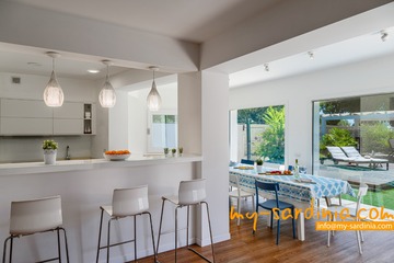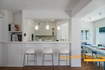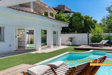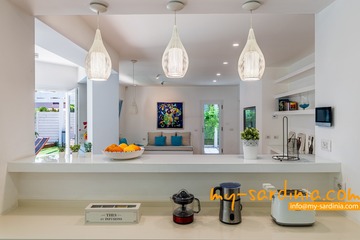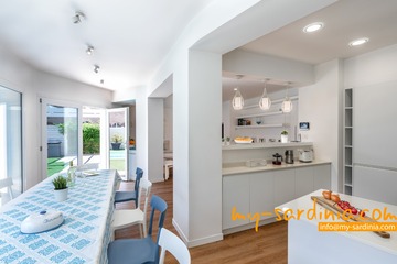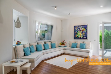 Diese geräumige Villa erstreckt sich mit etwa 210qm Wohnfläche über 2 Etagen und bietet Platz für bis zu 10 Gäste. Die moderne Einrichtung ist in hellen Farbtönen gehalten. Im lichtdurchfluteten Erdgeschoß befinden sich der Wohn- und Essbereich der Villa sowie eine bestens ausgestattete, offene Küche. Die große Sofa-Gruppe gruppiert sich um einen Flachbildschirm, vom Essbereich geht der Blick zum eigenen Pool.