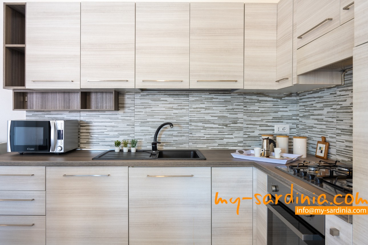 The heart of the complex is the spacious communal pool, shared by all three apartments. Each unit has its own pavilion right by the pool – ideal for a cosy breakfast or balmy evenings under the Sardinian starry sky. As a special highlight, each apartment also has its own private jacuzzi. Sun loungers, a shared barbecue area and an outdoor shower complete the facilities for a thoroughly relaxing holiday.