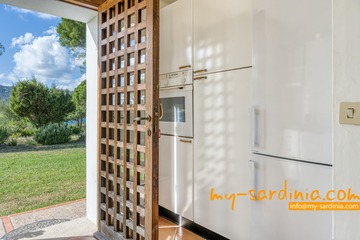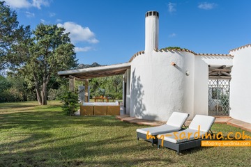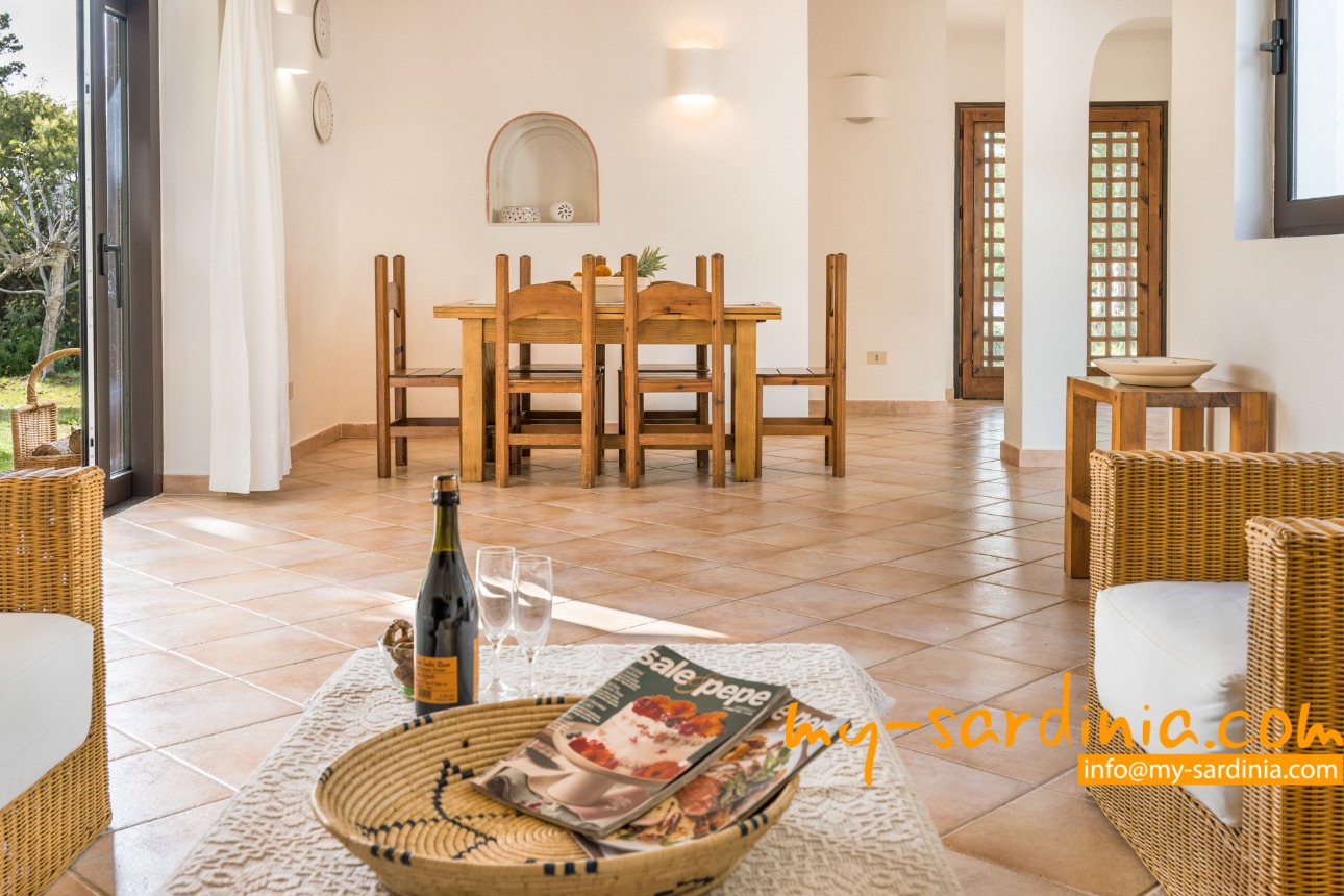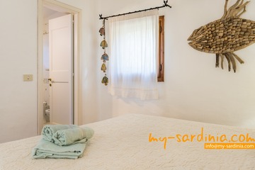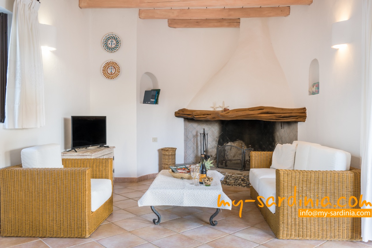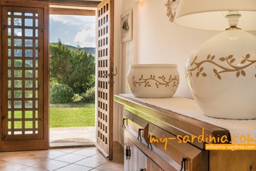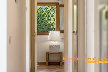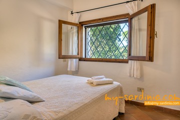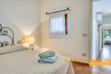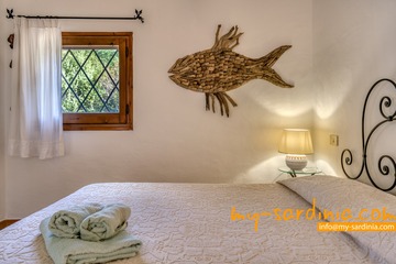 On the covered terrace you can relax on the comfortable rattan armchairs and enjoy the tranquillity of Lu Postu. The terrace is connected to the living area of the house by large sliding glass doors, so that you can also enjoy the view of the greenery from inside. The house is tastefully furnished in Sardinian style. A seating area in the living room faces the large fireplace and there is a large dining area adjacent to the living room. The separate kitchen is well equipped with oven, gas cooker, dishwasher and a large refrigerator. Thanks to the air conditioning, the villa can be kept at a pleasant temperature even in the height of summer.