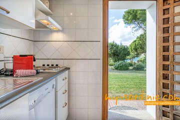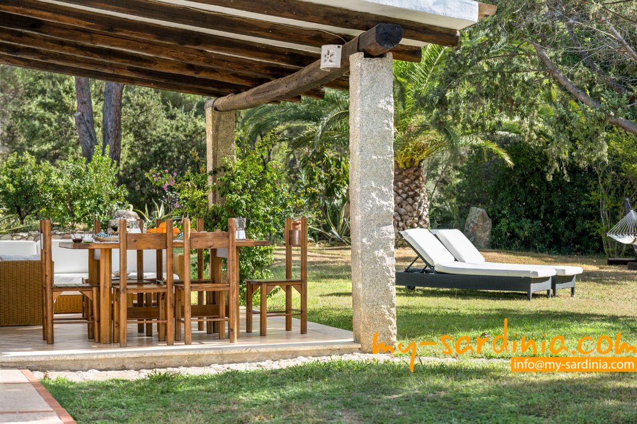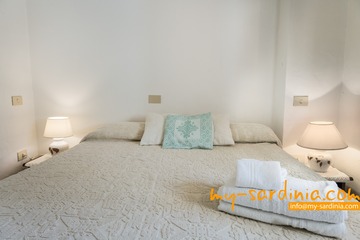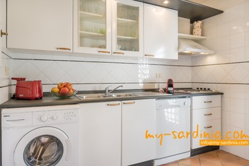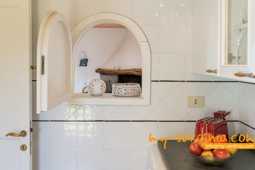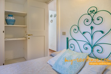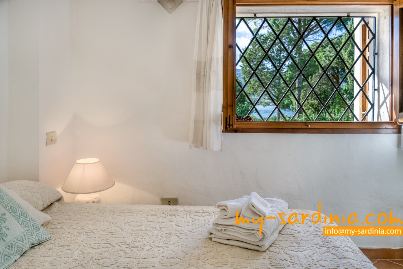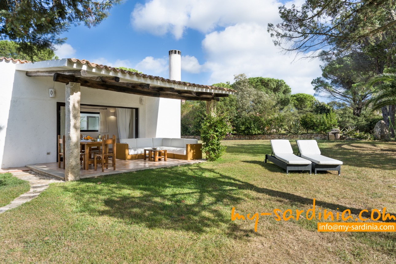On the covered terrace you can relax on the comfortable rattan armchairs and enjoy the tranquillity of Lu Postu. The terrace is connected to the living area of the house by large sliding glass doors, so that you can also enjoy the view of the greenery from inside. The house is tastefully furnished in Sardinian style. A seating area in the living room faces the large fireplace and there is a large dining area adjacent to the living room. The separate kitchen is well equipped with oven, gas cooker, dishwasher and a large refrigerator. Thanks to the air conditioning, the villa can be kept at a pleasant temperature even in the height of summer.