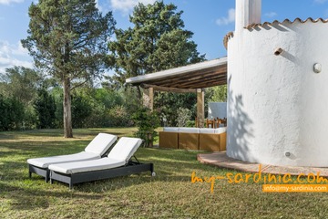 The property belonging to the villa is about 3,000 square metres and is overgrown with palm trees, pine trees and Mediterranean macchia. A lawn around the house offers space for sunbathing or for the children to run around.