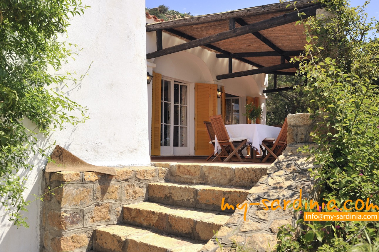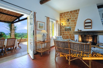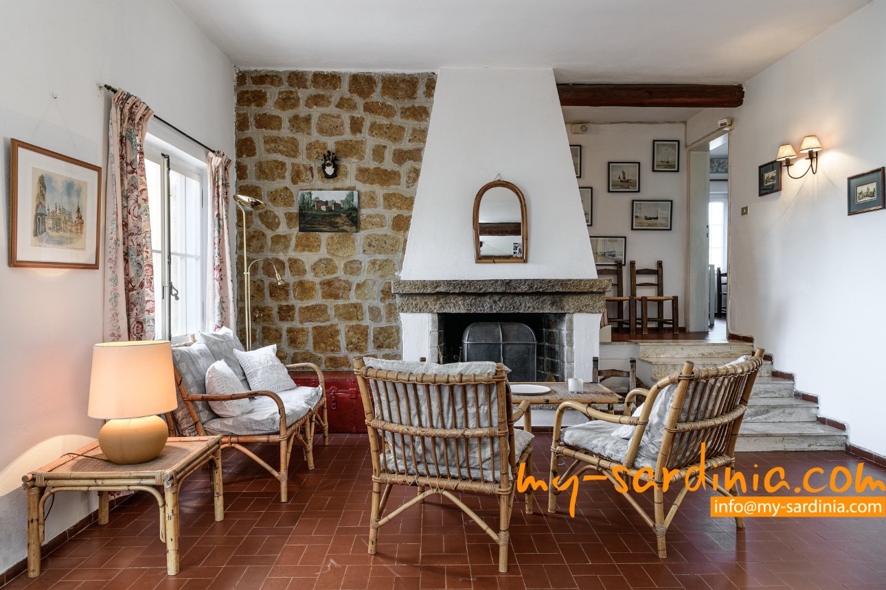 Villa Bau Cannas accommodates up to 6 people in three bedrooms spread over two levels. The heart of the house is the spacious living room with exposed wooden beams, warm terracotta floors and an open-plan fireplace – in the early and late seasons, it invites you to spend long evenings by the glow of the fire. Large patio doors open the living room onto the covered, thatched terrace, which features a large dining table and offers sweeping views across the coastal landscape and the sea. The fully equipped kitchen includes a dishwasher, oven and fridge; a serving hatch connects it to the living room.