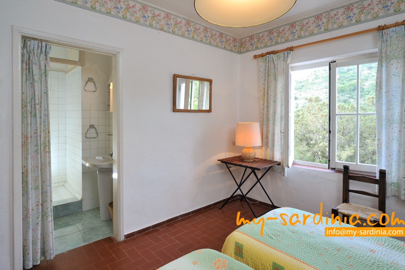 The first bedroom is on the upper floor and has a double bed as well as a small balcony with a direct view of the beach – a sight that makes the day unique from the moment you wake up. The en-suite bathroom features both a shower and a bath. The second bedroom, with two single beds, and the third, a double room newly built in 2019 with its own garden access, each have their own en-suite bathroom, meaning all three sleeping areas are self-contained. Villa Bau Cannas does not have air conditioning, but thanks to its location above the beach, a gentle breeze often provides welcome relief from the heat.