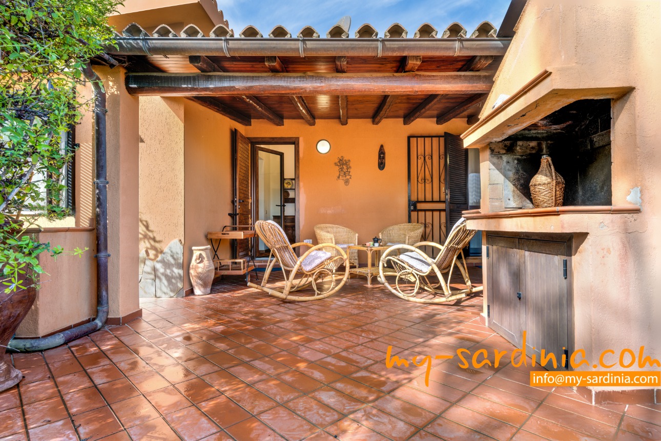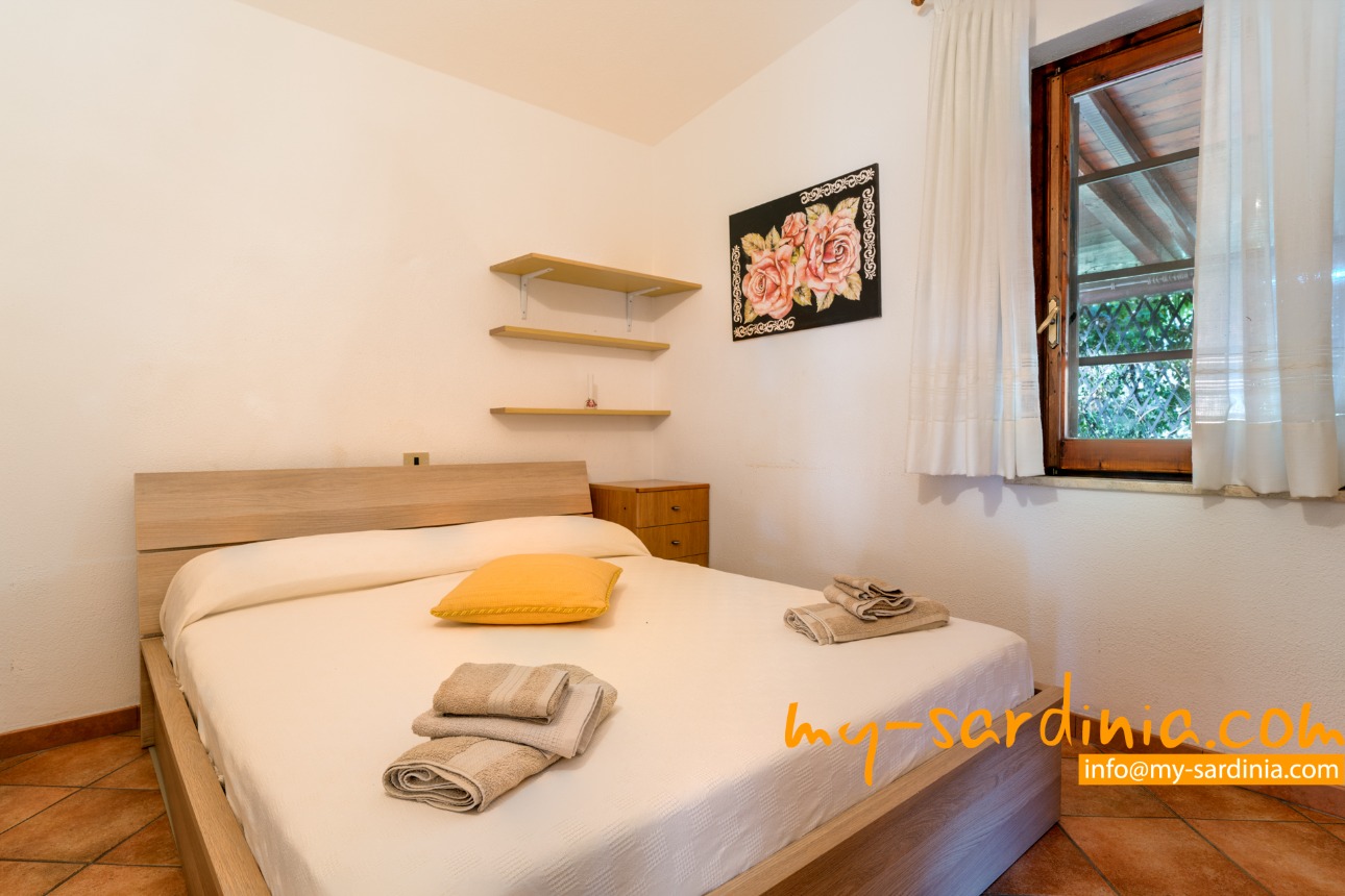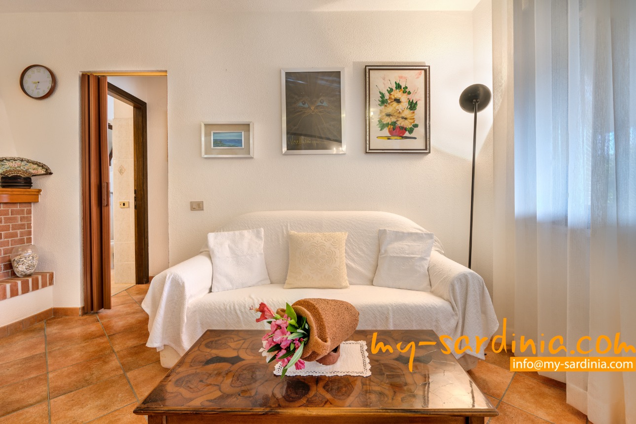 Villa de Janas has a ground floor living area of around 100 m², complemented by two spacious covered terraces at the front and rear, which are perfect for long evenings outdoors. Both terraces provide access to the bright living room inside the house with a cosy sitting area, dining table and a functional kitchenette. The traditional Mediterranean furnishings give the house a lot of authenticity and a warm, homely character that immediately conveys a feeling of "arrival".