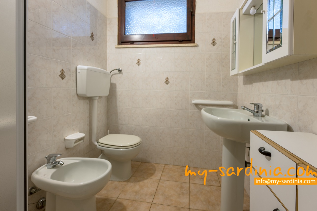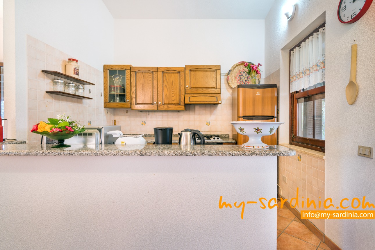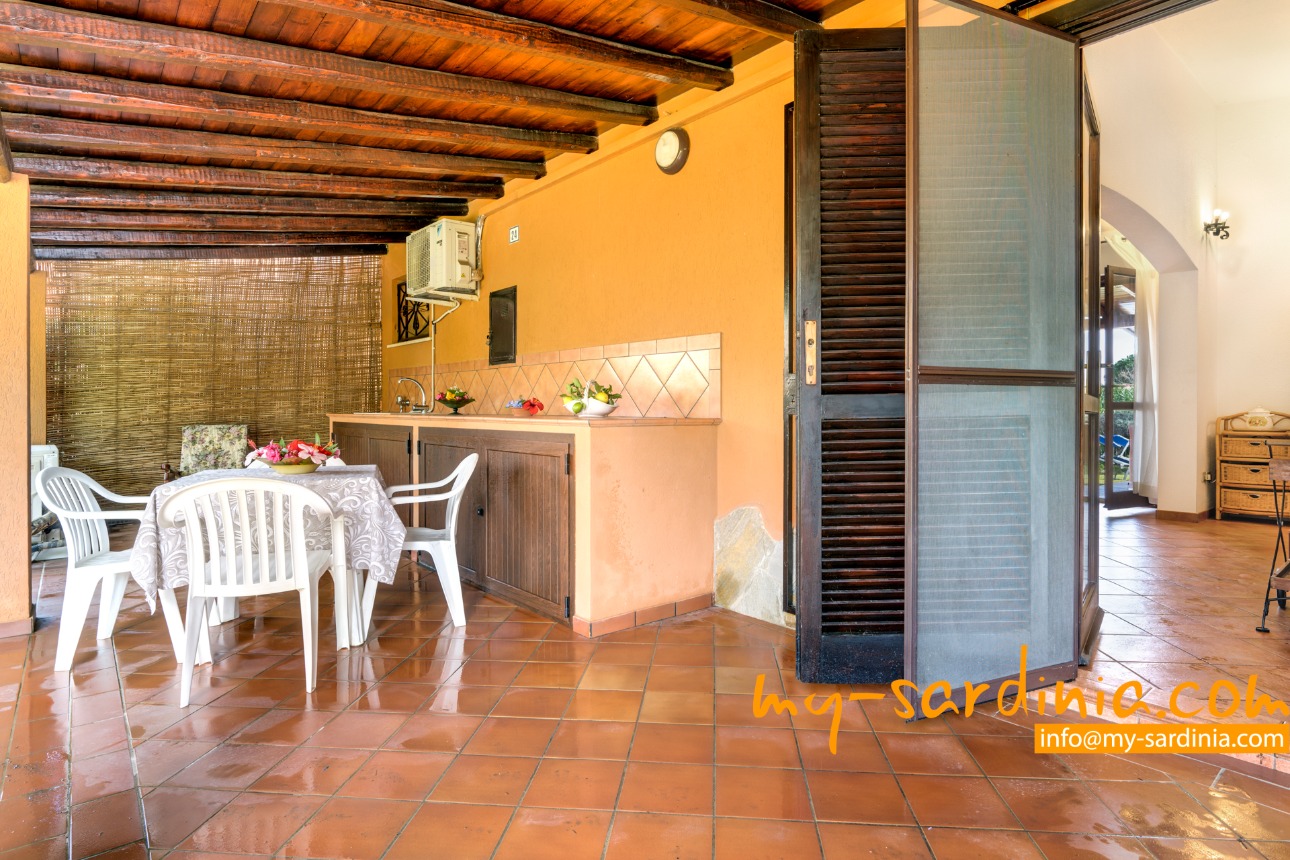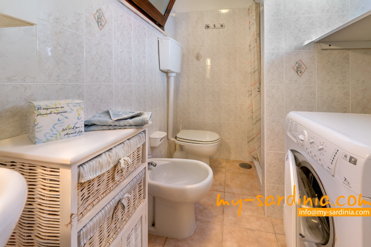 Villa de Janas has a ground floor living area of around 100 m², complemented by two spacious covered terraces at the front and rear, which are perfect for long evenings outdoors. Both terraces provide access to the bright living room inside the house with a cosy sitting area, dining table and a functional kitchenette. The traditional Mediterranean furnishings give the house a lot of authenticity and a warm, homely character that immediately conveys a feeling of "arrival".